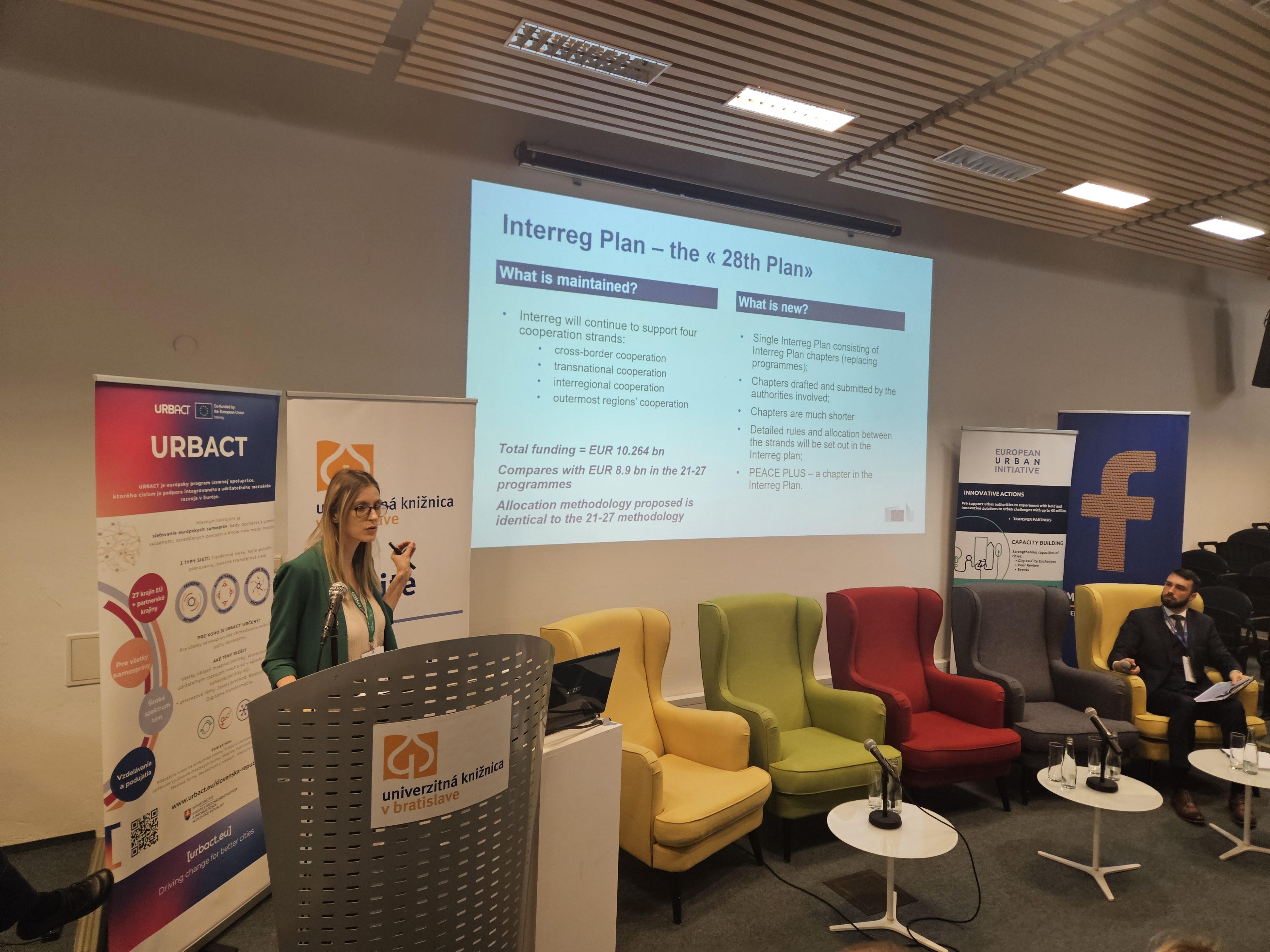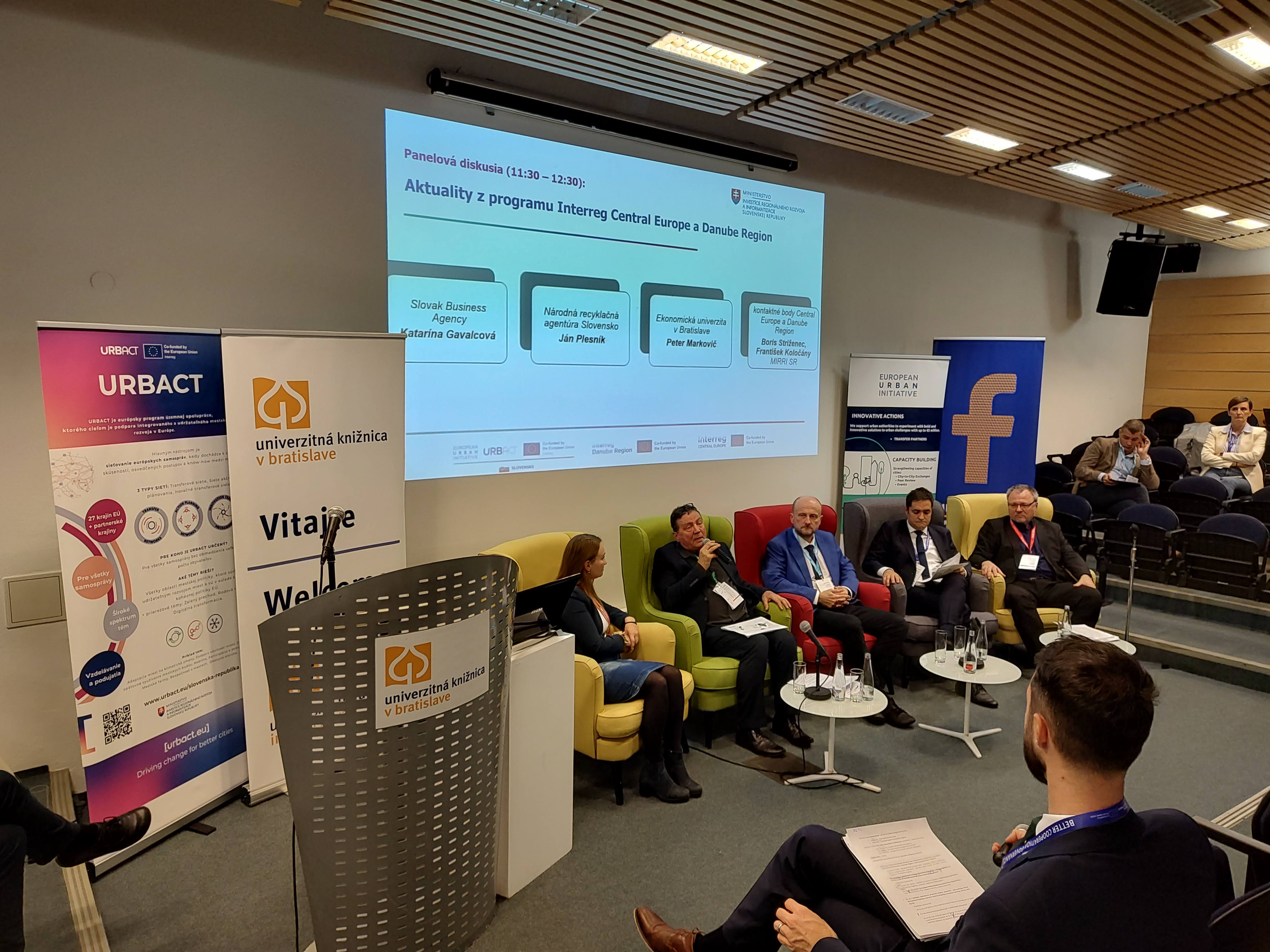 Svoje skúsenosti predstavili účastníci z viacerých programov nadnárodnej spolupráce, z verejného i súkromného sektora: V panelovej diskusii: Aktuality z programu Interreg Central Europe a Interreg Danube Region: národné kontaktné body Interreg Central Europe a Interreg Danube Region Programme (Boris Striženec, František Koločány, MIRRI SR), Slovak Business Agency (Katarína Gavalcová), Národná recyklačná agentúra Slovensko (Ján Plesník) a Ekonomická univerzita v Bratislave (Peter Markovič)