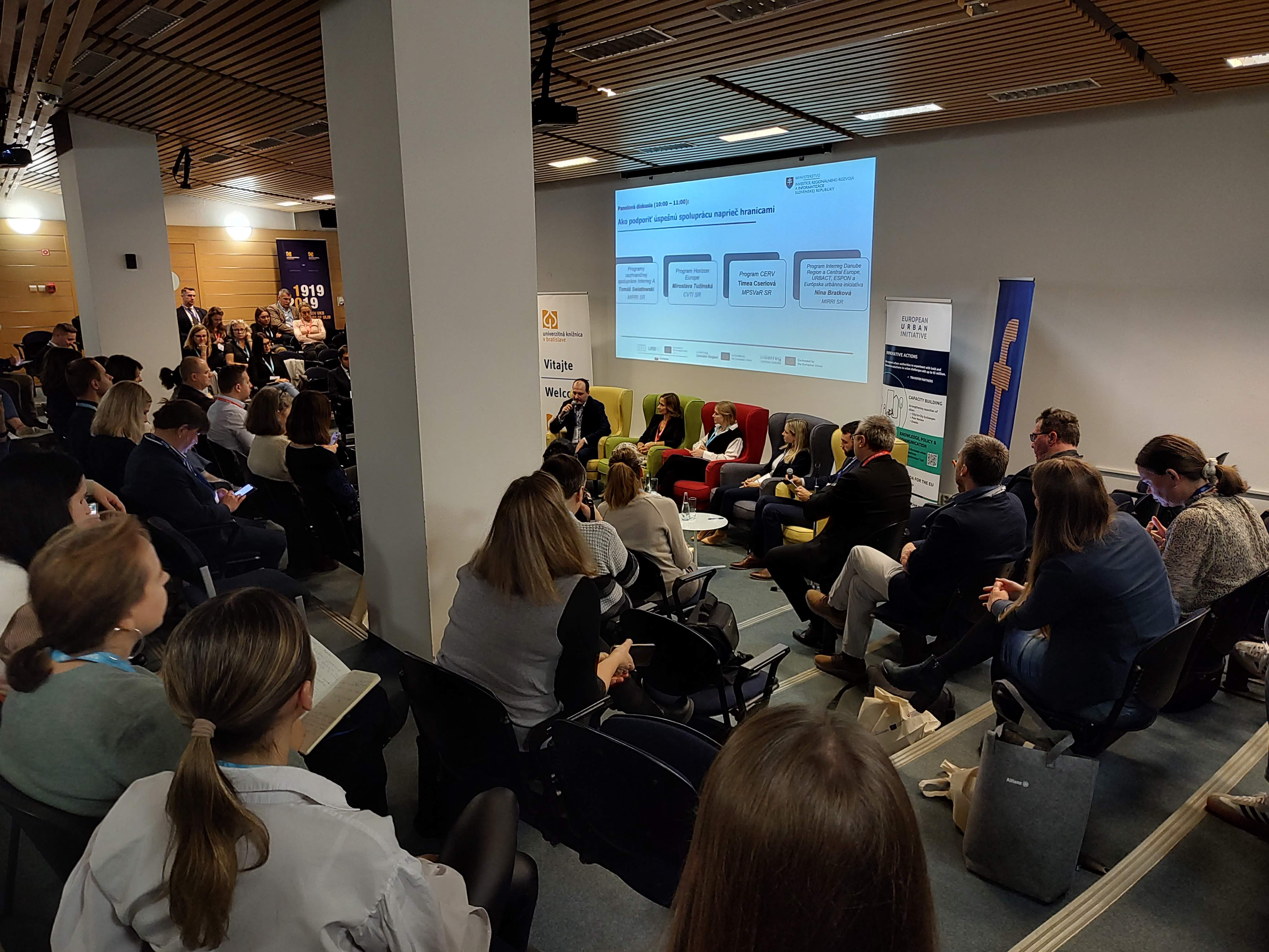 Svoje skúsenosti predstavili účastníci z viacerých programov nadnárodnej spolupráce, z verejného i súkromného sektora: V panelovej diskusii: Aktuality z programu Interreg Central Europe a Interreg Danube Region: národné kontaktné body Interreg Central Europe a Interreg Danube Region Programme (Boris Striženec, František Koločány, MIRRI SR), Slovak Business Agency (Katarína Gavalcová), Národná recyklačná agentúra Slovensko (Ján Plesník) a Ekonomická univerzita v Bratislave (Peter Markovič)